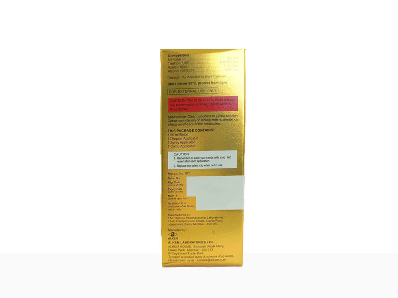 Minokem-N 2% Solution contains Minoxidil, a vasodilator that enhances blood flow to hair follicles and prolongs the hair growth phase. Azelaic Acid supports scalp health and may help reduce factors contributing to hair follicle miniaturization, while Tretinoin enhances penetration and cellular turnover, improving overall treatment efficacy. Together, these ingredients work synergistically to promote visible hair regrowth and reduce ongoing hair fall.